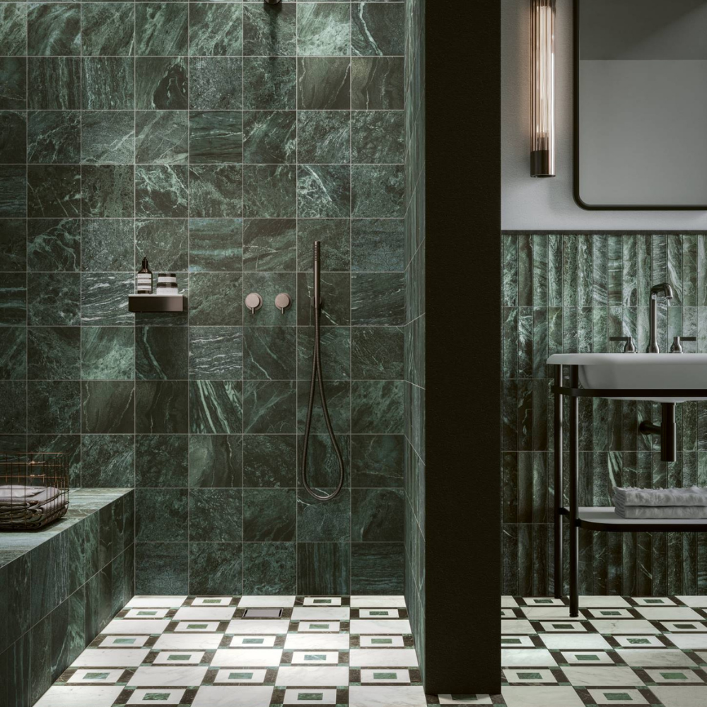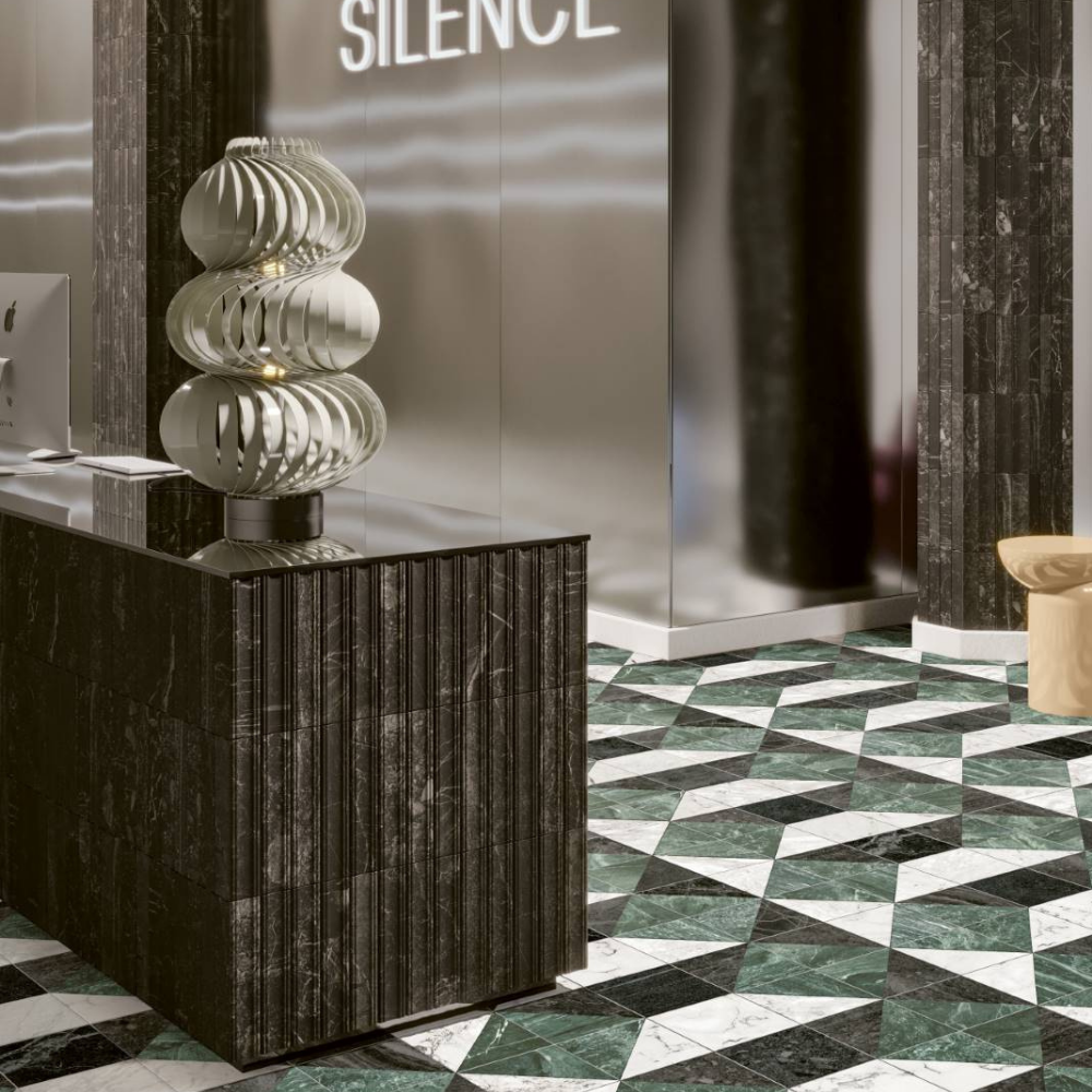 This porcelain stoneware collection reinterprets classic marble aesthetics through a contemporary and decorative approach. Defined by contrast tones and geometric details, it offers a dynamic and versatile surface enriched by coordinating inlays and accessory elements. The distressed matt finish enhances its character, creating refined ceramic coverings suitable for elegant interior spaces.
