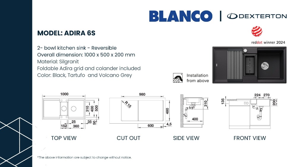• The multifunctional ADIRA grid is included and can be used to create a top-level on the bowl or as a drainer.