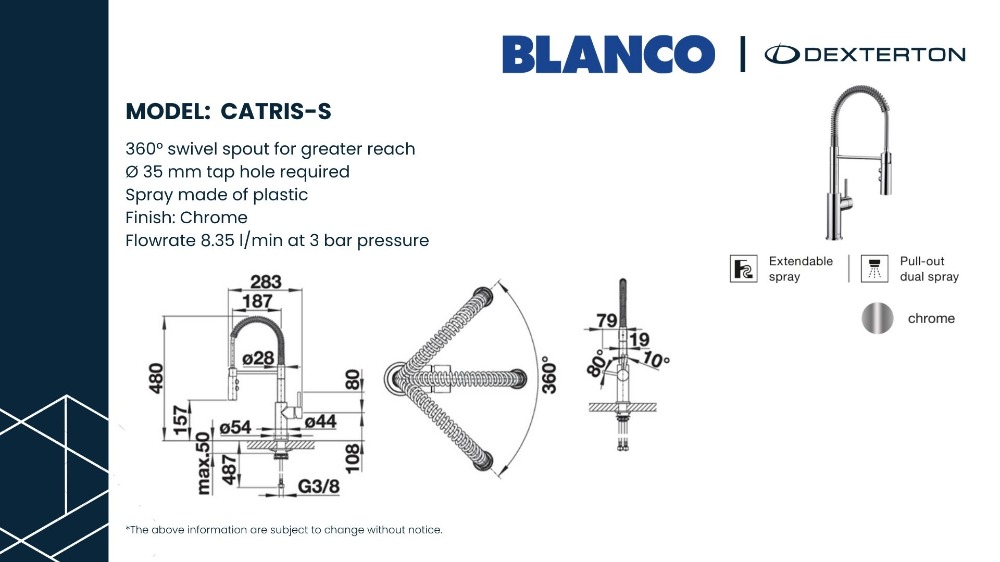 BLANCO CATRIS is a semi-professional mixer tap in a classic design that is bound to delight enthusiastic home cooks. The chrome mixer tap comes with an array of practical features: the flexible high-pressure spout is surrounded by a stainless steel spring and has a maneuverable and easy removable pull-out spray. As such, a CATRIS mixer tap makes cleaning even large pots and pans a breeze. In addition, the practical dual spray allows you to switch from a steam to a jet spray at the touch of a button. You can use the gentle stream flow to rinse delicate ingredients and materials, such as berries or glasses. The powerful jet spray, by contrast, is great for filling cooking pots with water quickly and conveniently. The CATRIS mixer tap works particularly well when combined with wall units, as it fills the space in-between to perfection.