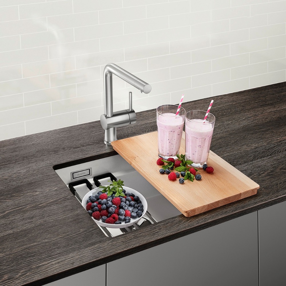 — Cutting boards attached to the worktop cut-out or the interior wall of the bowl increase the functionality