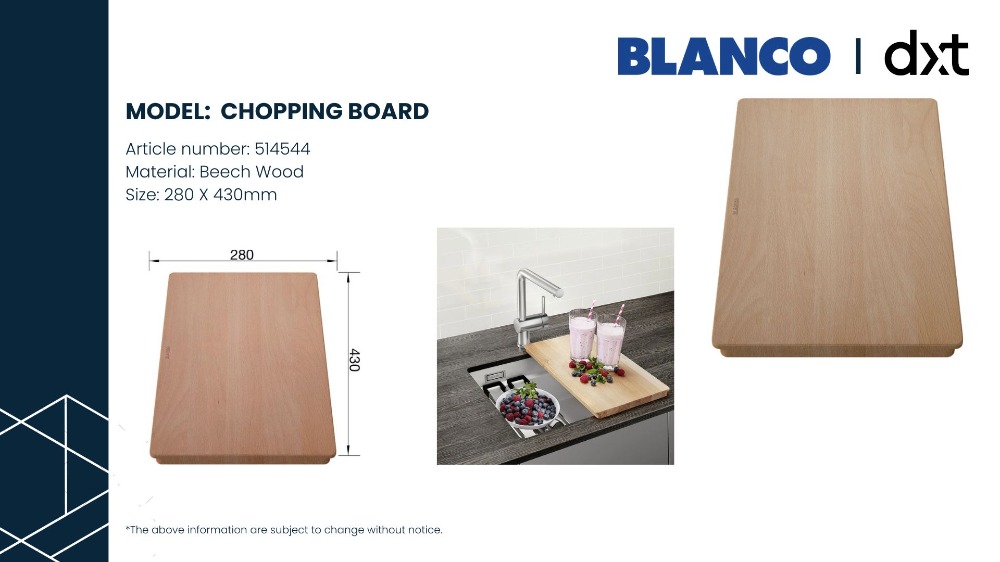 Depending on your sink installation, our cutting boards will fit on top of the bowl or seamlessly slide over the counter top, transforming your sink area into a multi-functional work space. BLANCO cutting boards are designed with a functional focus so you can streamline your workflow and focus on the task at hand.