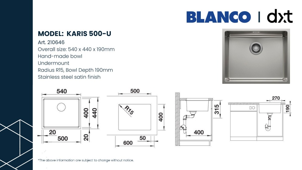 — Radius R15, Bowl Depth 190mm