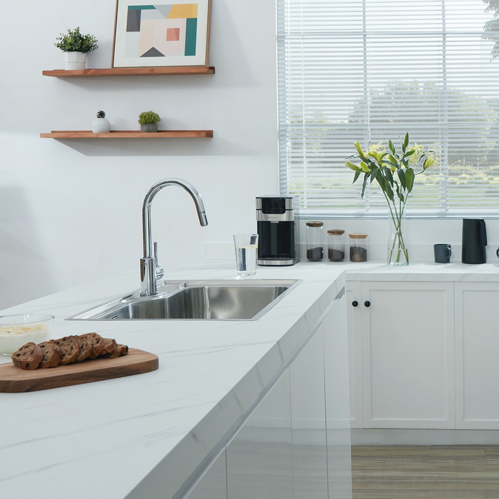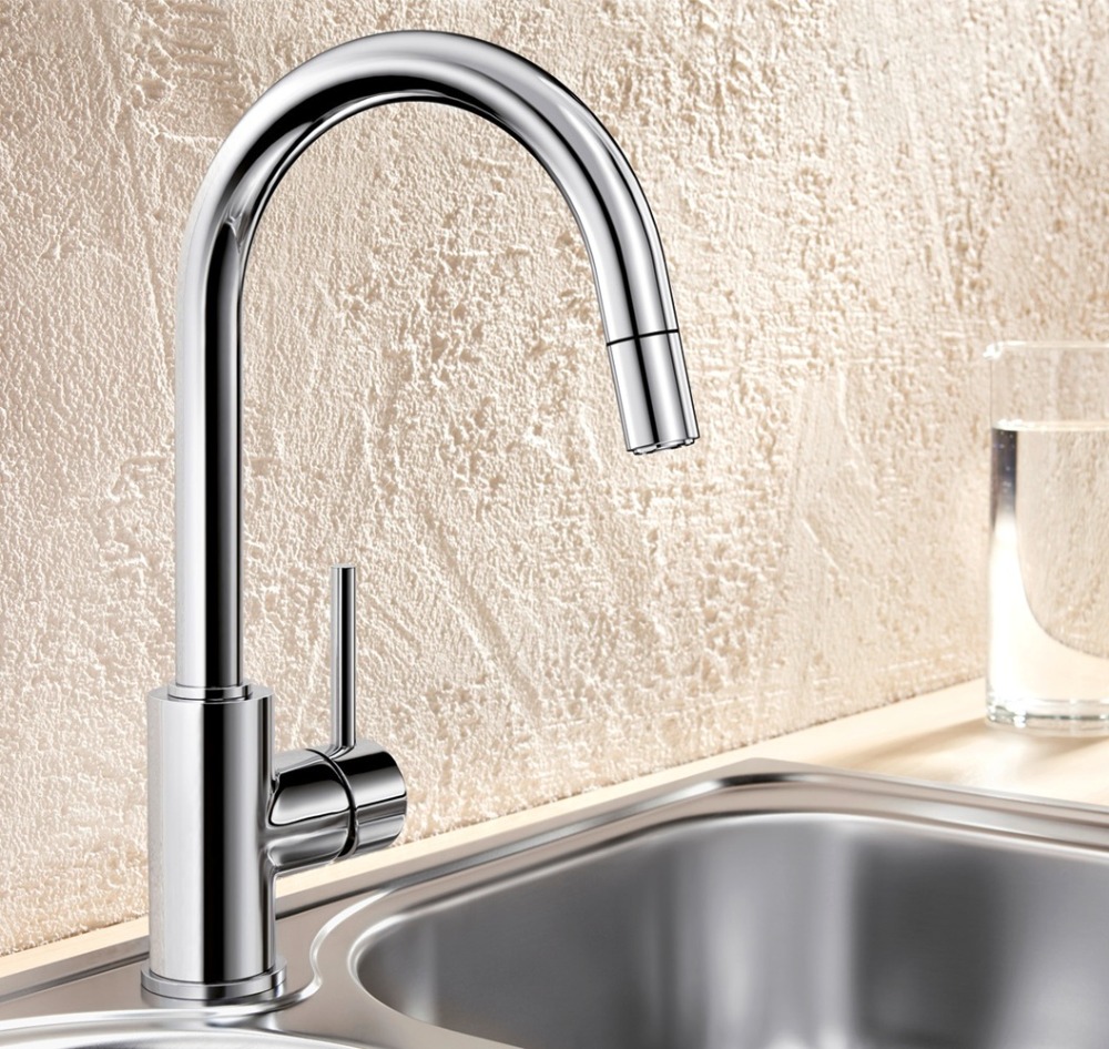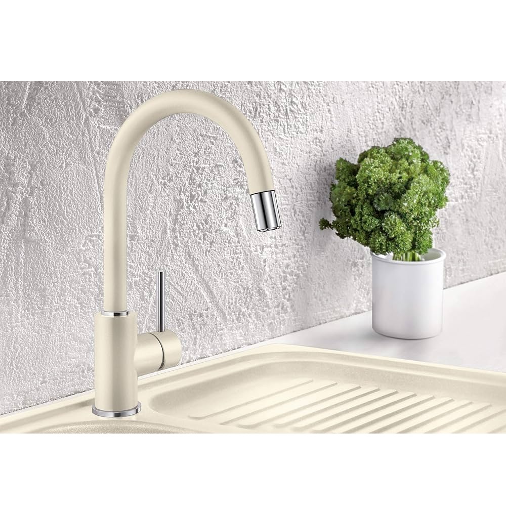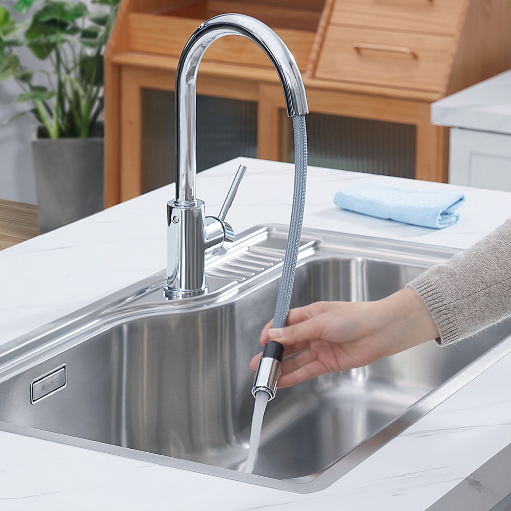 Designed with a gently rounded spout on a slender body, this faucet allows easy filling of tall pots and vases while remaining especially suitable for compact sinks. The 360° swivel spout creates an enlarged working radius for greater flexibility, and the pull-down spray hose adds extra reach and control for everyday convenience.