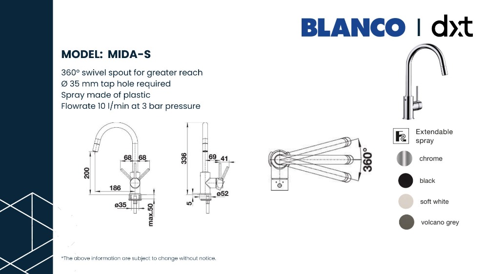 MIDA-S C4A — 360° swivel spout for greater reach — Ø 35 mm tap hole required — With ceramic disk cartridge — Patented jet regulator for markedly reduced scaling — Spray made of plastic — Nylon-sheathed spray hose — Hose weight for reliable retraction — Flexible connector pipes, 500 mm long and ⅜'' nut