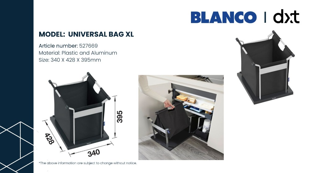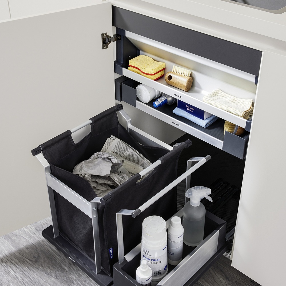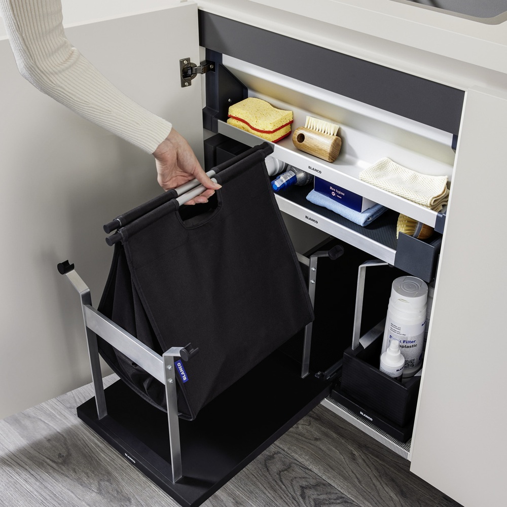 UNIVERSAL BAG XL — XL Bag for storage or collection of dry recycling materials such as glass, paper, cans or plastics — Strong aluminium structure securely holds the XL bag open inplace — Easy access thanks to the wide opening and the full-extension sliding function — Portable XL bag can be easily removed and placed back on the sliding basetray — Design in dark grey and aluminium matching all BLANCO cabinet organization elements