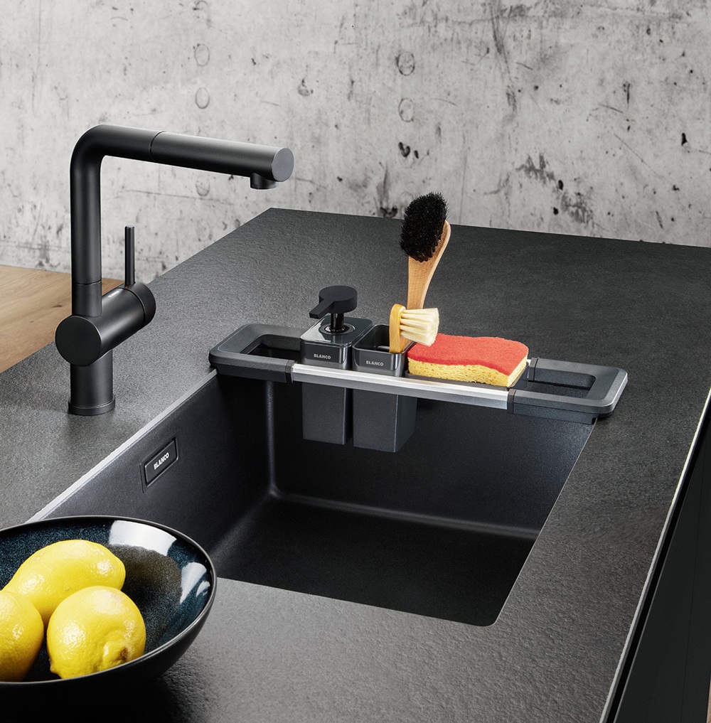 — Upgraded kitchen functionality with set including extendable sink rack, soap dispenser, a small container for cleaning utensils and a drip tray