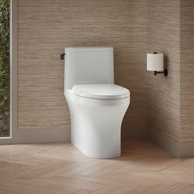 Features Compact, streamlined one-piece toilet Compact elongated bowl offers added comfort while requiring less space Standard height 1.28 gpf (4.8 lpf) Left-hand Polished Chrome trip lever 1-15/16" (49 mm) fully glazed trapway Fully skirted trapway simplifies cleaning Quiet-Close™ elongated lid and seat prevents slamming Quick-Attach™ hardware for fast and secure installation Quick-Release™ functionality allows seat to be removed easily from toilet for convenient cleaning Coordinates with other products in the Spacity™ collection