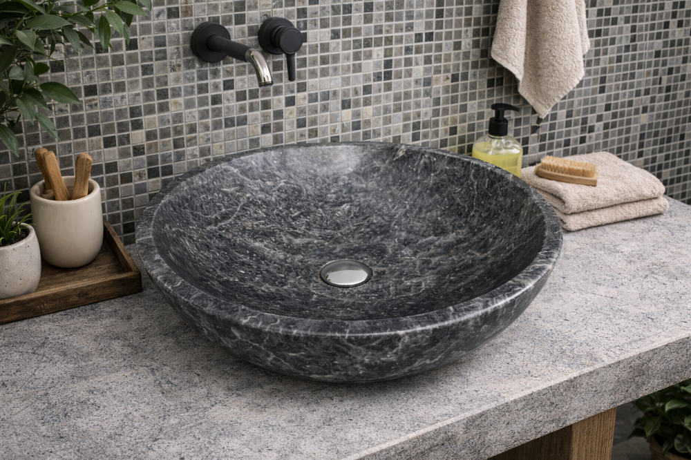 Designed as a round vessel basin, it sits beautifully above the countertop, creating a luxurious focal point for contemporary, spa-inspired, or designer bathrooms. The smooth stone surface is carefully finished to enhance the natural texture while maintaining durability for everyday use.