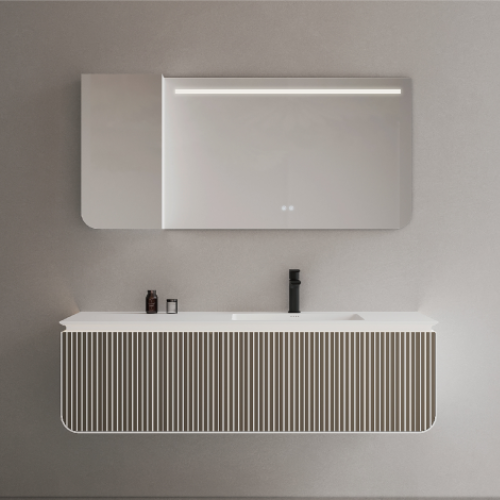 The sintered stone countertop provides a durable, scratch-resistant surface that maintains its elegant finish over time. Paired with a smooth ceramic basin, it offers easy maintenance and reliable everyday use. The under cabinet and side cabinet provide additional storage to keep toiletries and bathroom essentials neatly organized.